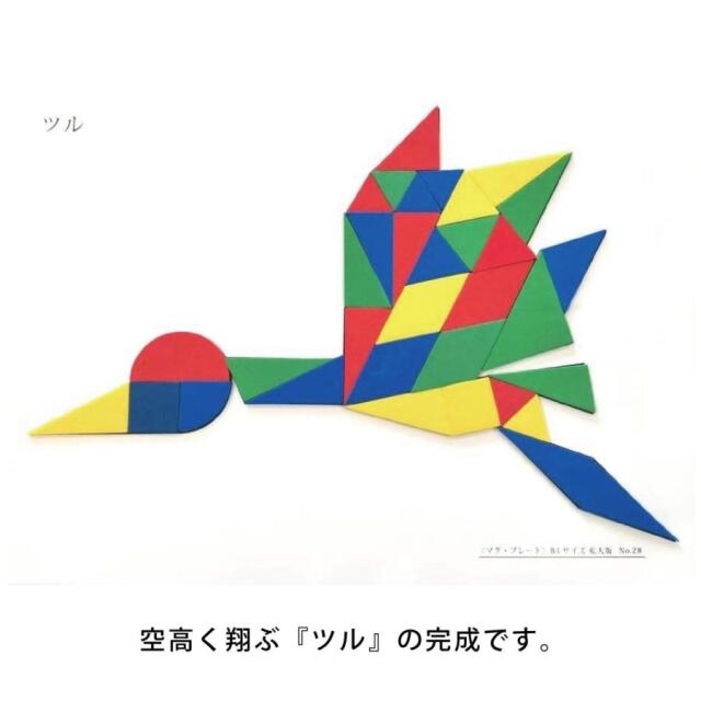 磁石付きのカラフルな図形ピースを並べて、形をつくっていきます。