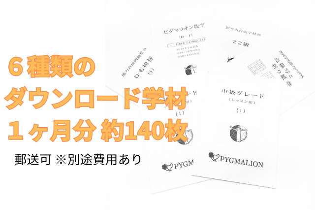 6種類(レッスン用、家庭学習用、能力育成問題集、ピグマリオン数学、点描写と折り紙、思考力育成学材)の学材(1ヶ月分約140枚)