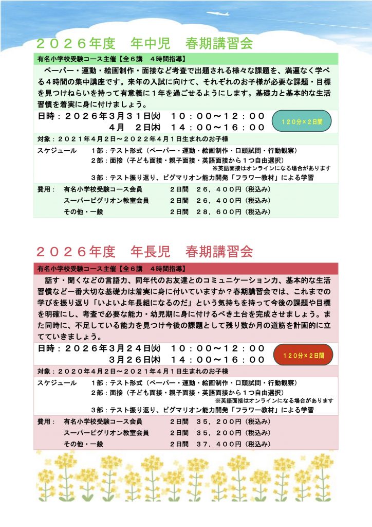 ピグマリオン千里中央教室(ぽぷら幼児童学園)では、「有名小学校受験コース春期講習会」を実施致します。